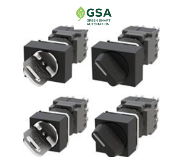 | Loại operator / thao tác | Knob xoay (rectangular bezel / square bezel), Key‑switch, selector, knob/handle, maintained / spring‑return / turn-reset / push‑lock tùy model. | Tương tự — knob, key, selector, maintained hoặc với khóa chìa, etc. |